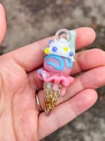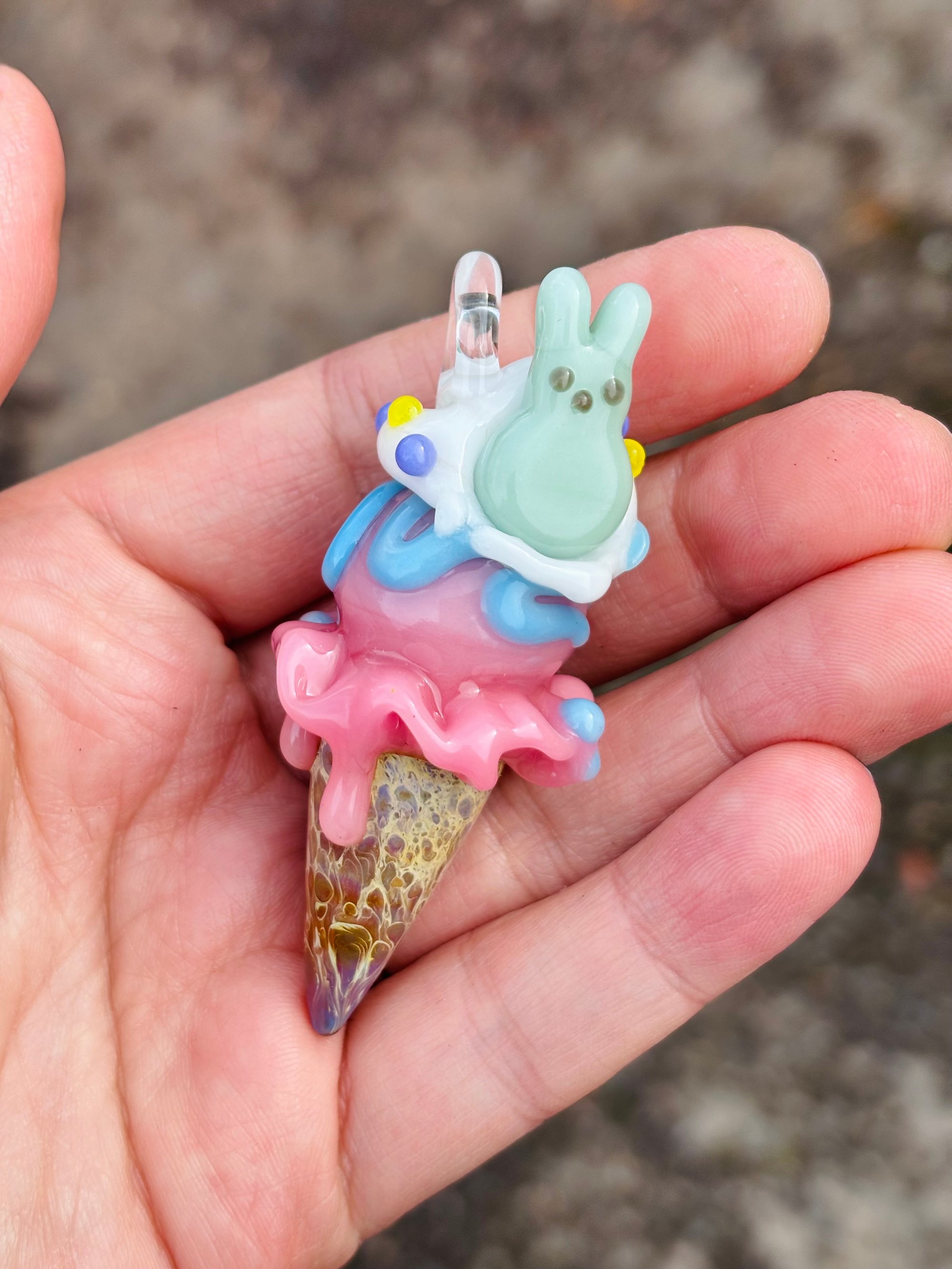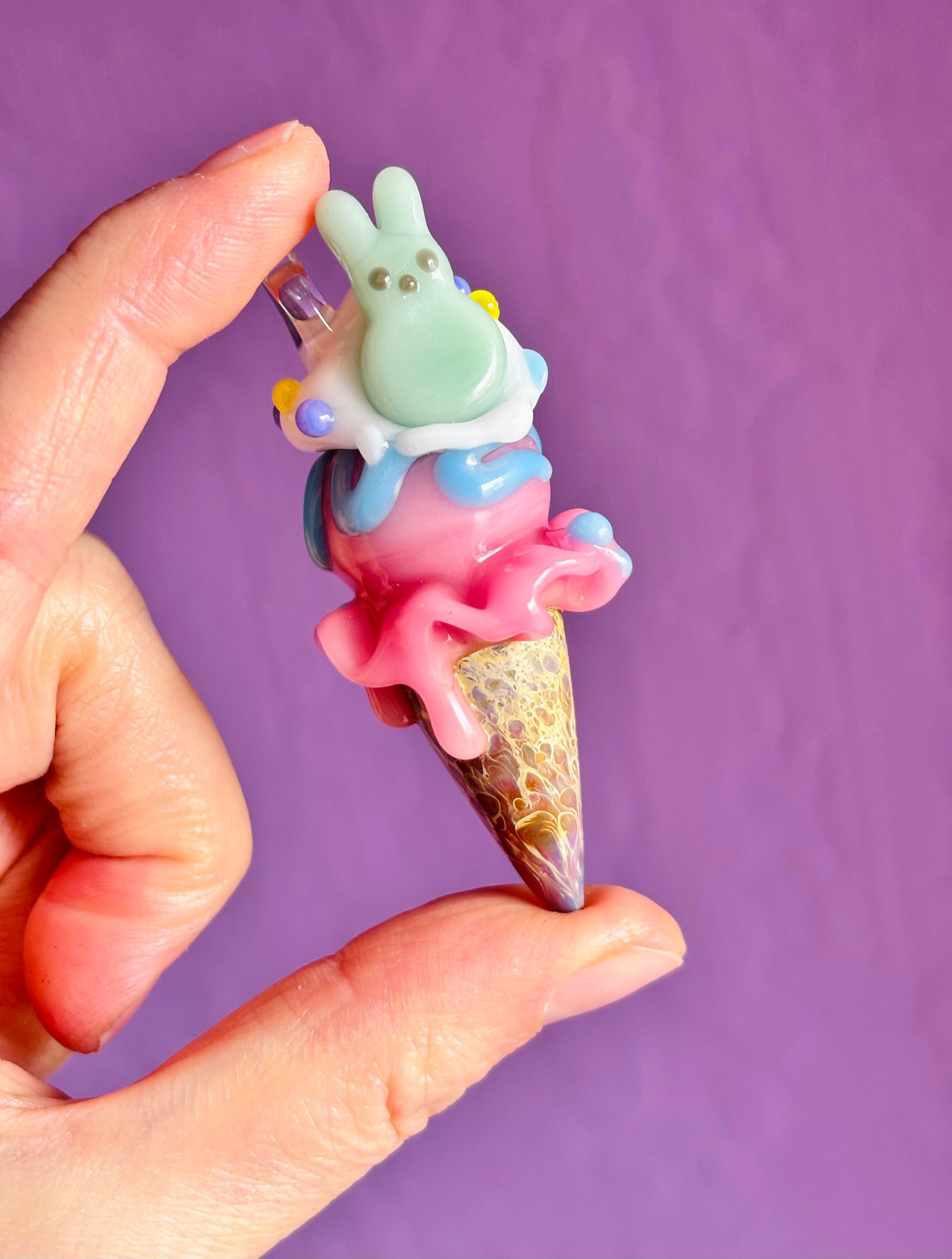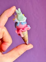 Bubblegum pink ice cream topped with blueberry drizzle, whipped cream, yellow and purple sprinkles and a mint marshmallow peep .