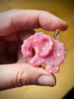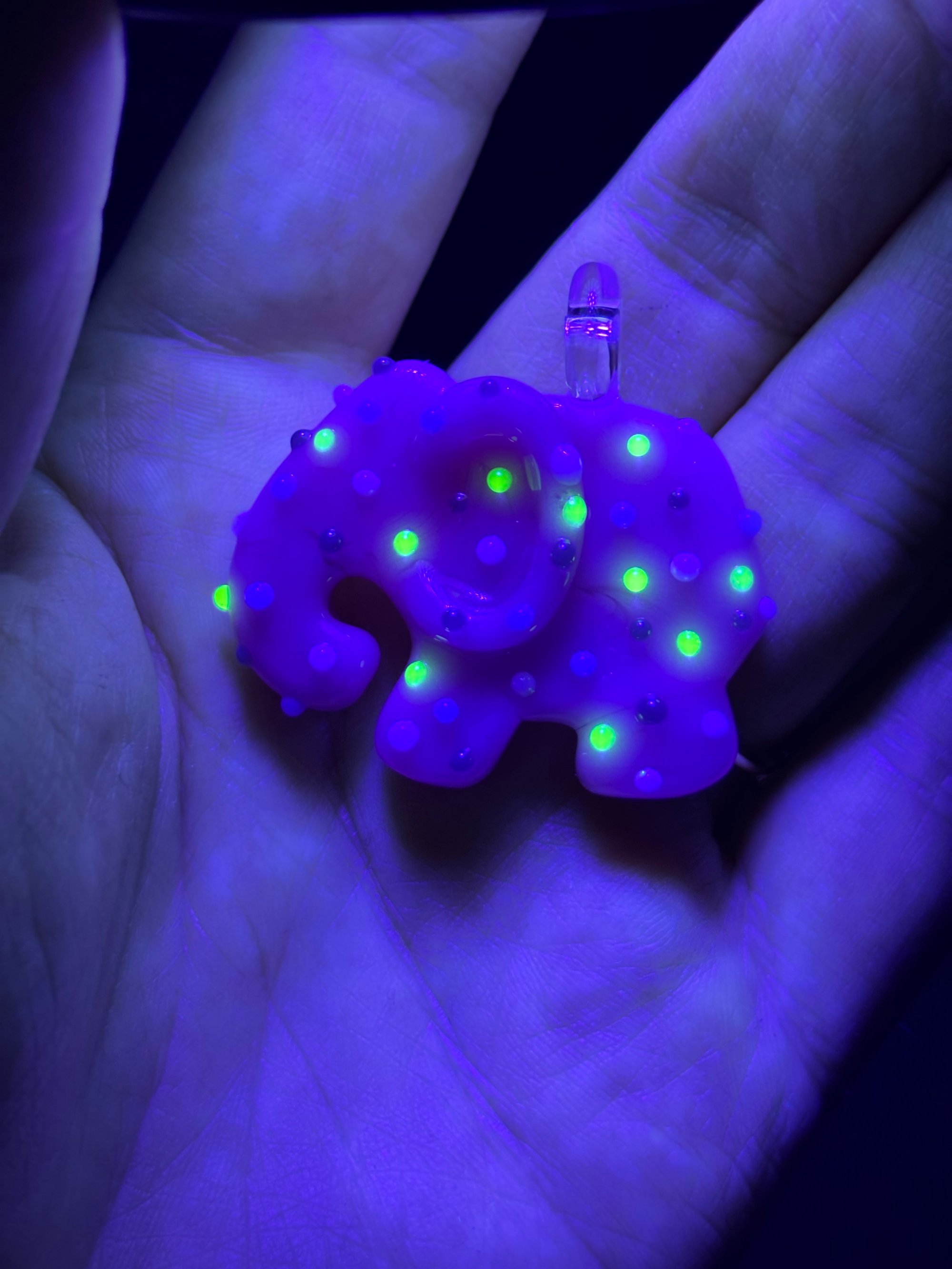 Classic pink animal cookie with light purple, dark green, white, and UV illuminati sprinkles.